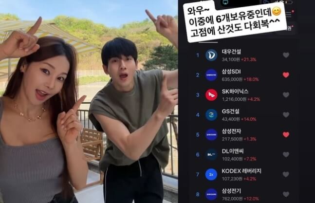 공개된 사진에는 주가 상승 중인, 기업들의 이름이 가득 담겨 눈길을 잡았다. 미나는 "고점에 산 것도 다 회복"이라 덧붙이기도 했다.