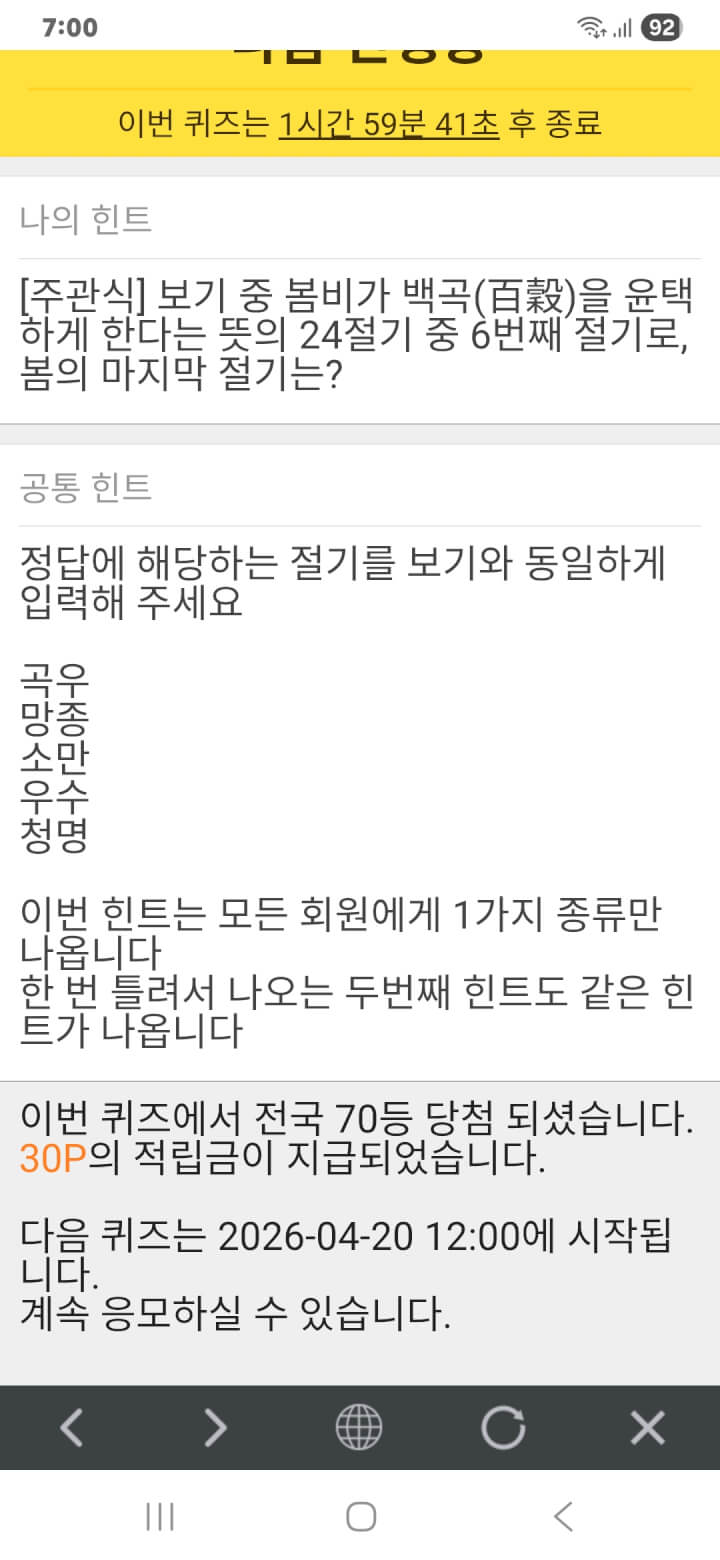 아침 퀴즈 이벤트 30원 획득 적립을 하였습니다. 감사합니다.