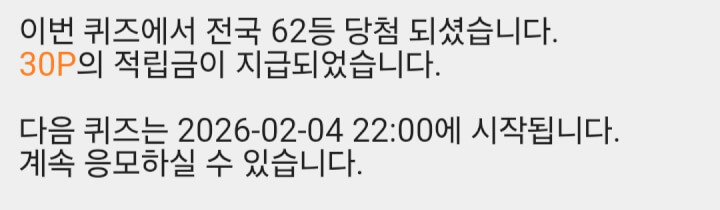 5시, 10시 퀴즈에서 30p 받았습니다 😊 함께해 주셔서 감사합니다 ❤️🩷🧡🍀