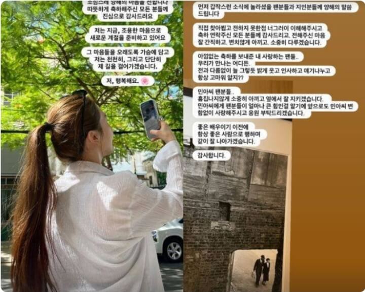 결혼 소감을 전하며 방민아는 “따뜻하게 축하해 주신 모든 분들께 감사드린다. 조용한 마음으로 새로운 계절을 준비하고 있다. 저 행복하다”고 말했다. 온주완 역시 “민아 씨 팬분들, 흠집 나지 않게 소중히 아끼고 곁에서 잘 지키겠다”고 다짐했다.