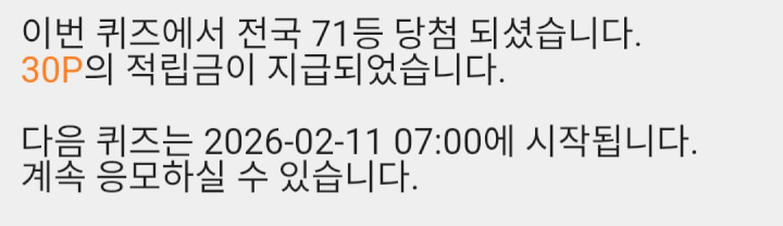10시 퀴즈에서 30p 받았습니다 😊 함께해 주셔서 감사합니다 ❤️🩷🧡🍀