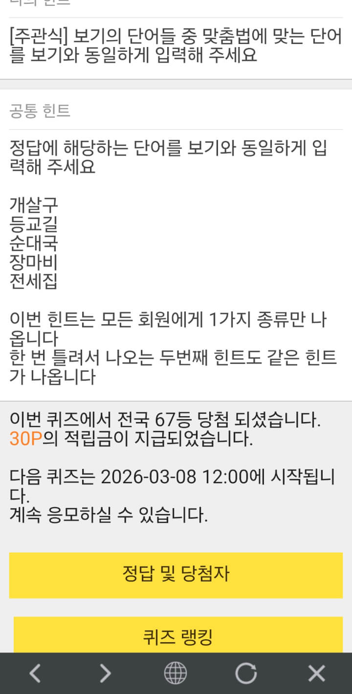 7시 퀴즈30점 받았어요. 12시 퀴즈 화이팅 하세요 ~~