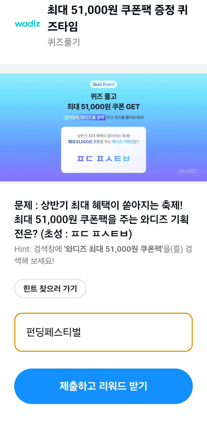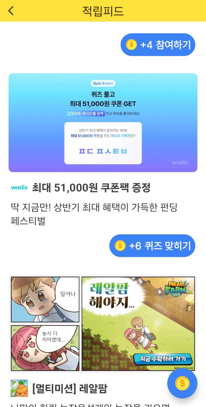 적립피드에 6점 초성퀴즈 적립 있어요. 답:펀딩페스티벌~~