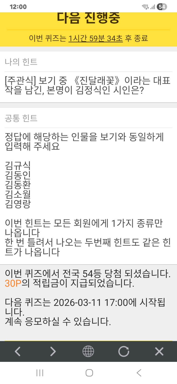 점심 퀴즈 이벤트 30원 획득 적립을 하였습니다. 감사합니다.